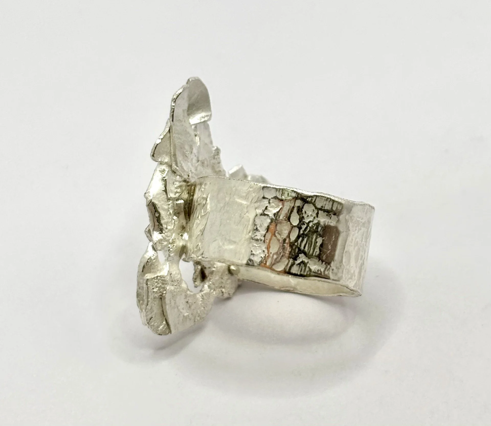 An asymmetric, uniquely textured sterling silver ring crafted from repurposed silver into a cool and shimmering heart for special and everyday wear.