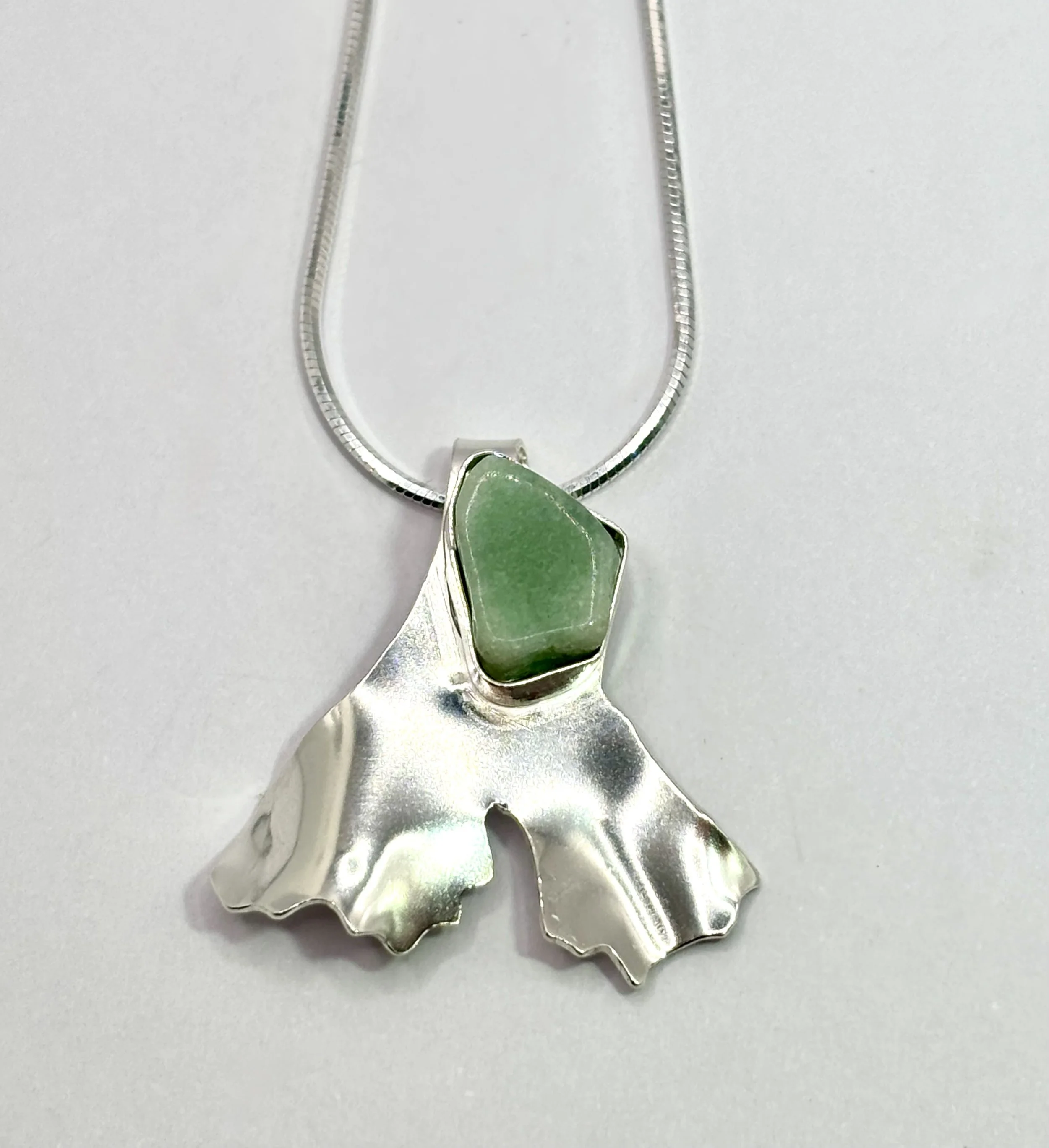 A fluid sterling silver Ginko leaf pendant and necklace holding a soft, earthy aventurine gemstone that echoes nature’s elegant forms.